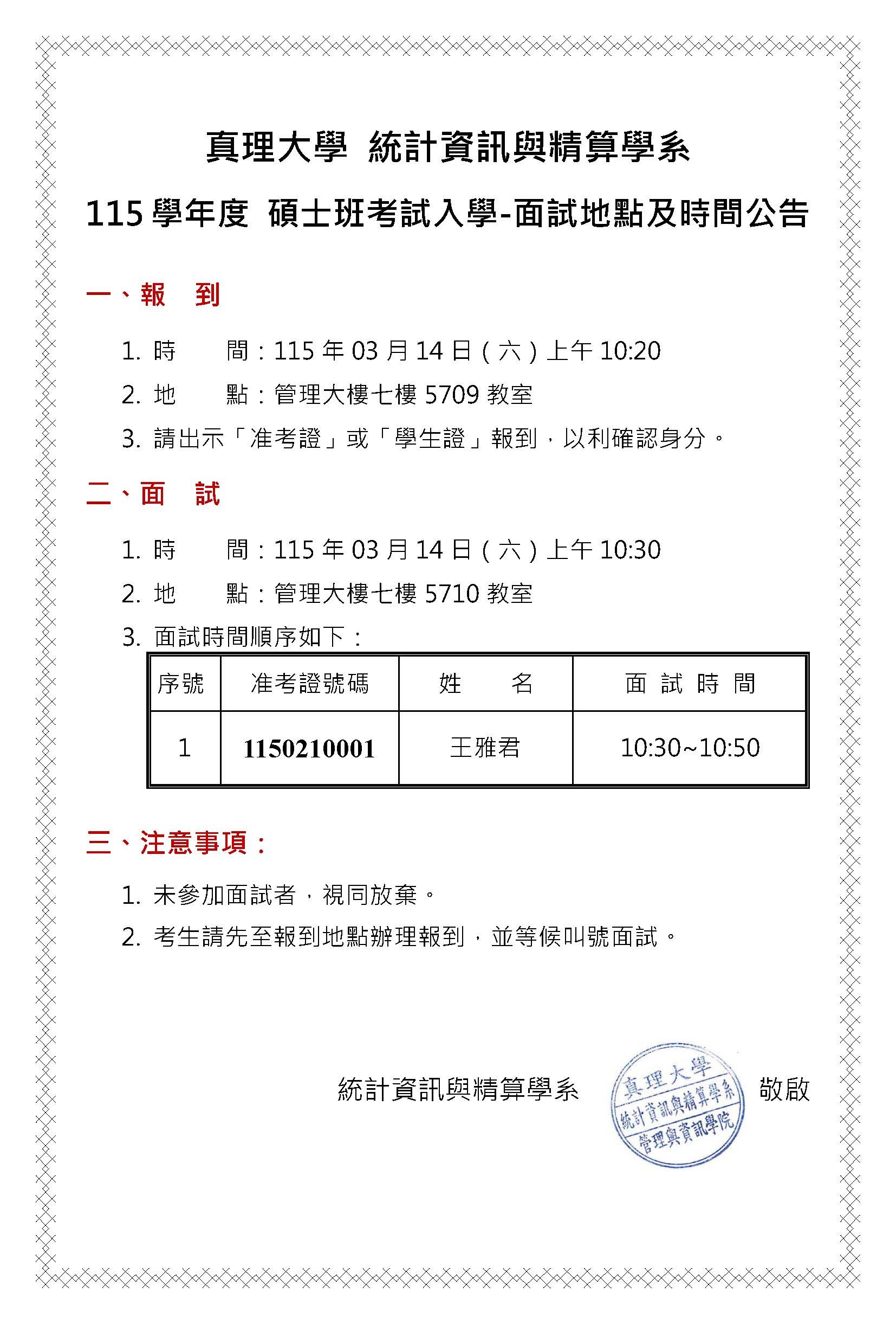 115學年度碩士班考試入學各學系所面試時間順序表及注意事項